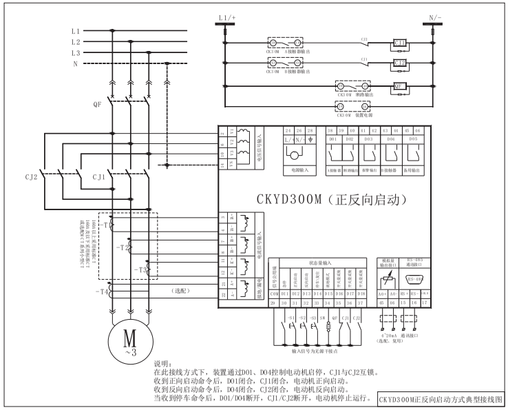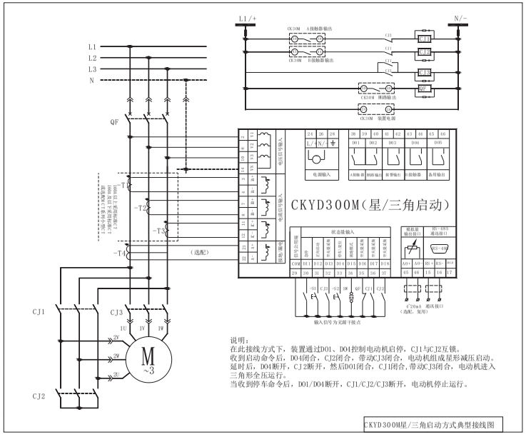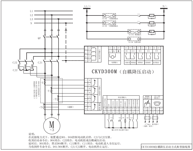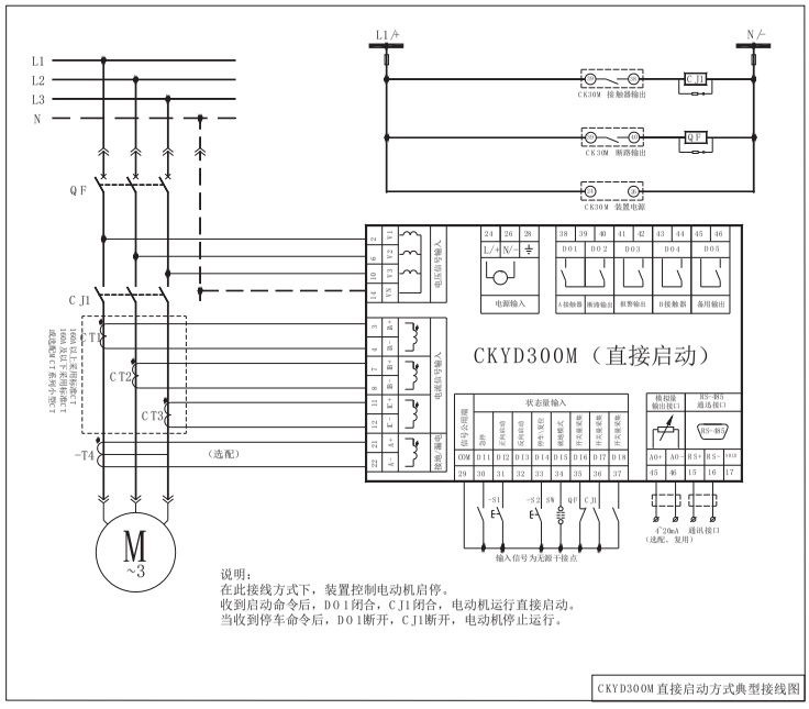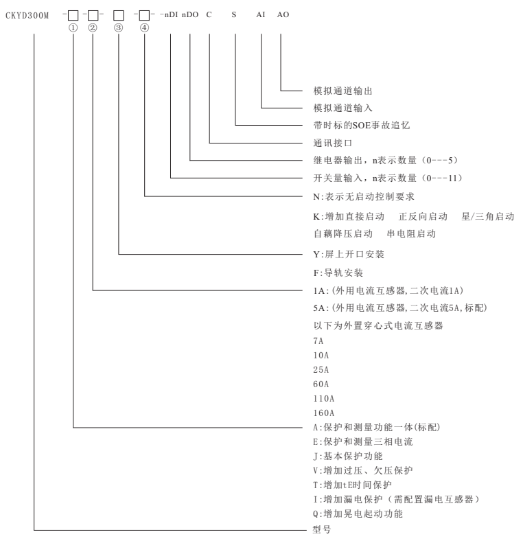4、舉例:CKYD300M-AJ-30A-Y-K-8DI-4DO-380V表示選擇保護和測量功能, 選擇基本型保護, 選用30A的外置穿心式電流互感器,屏上開口安裝,增加啟動控制,電壓接入為380V。
