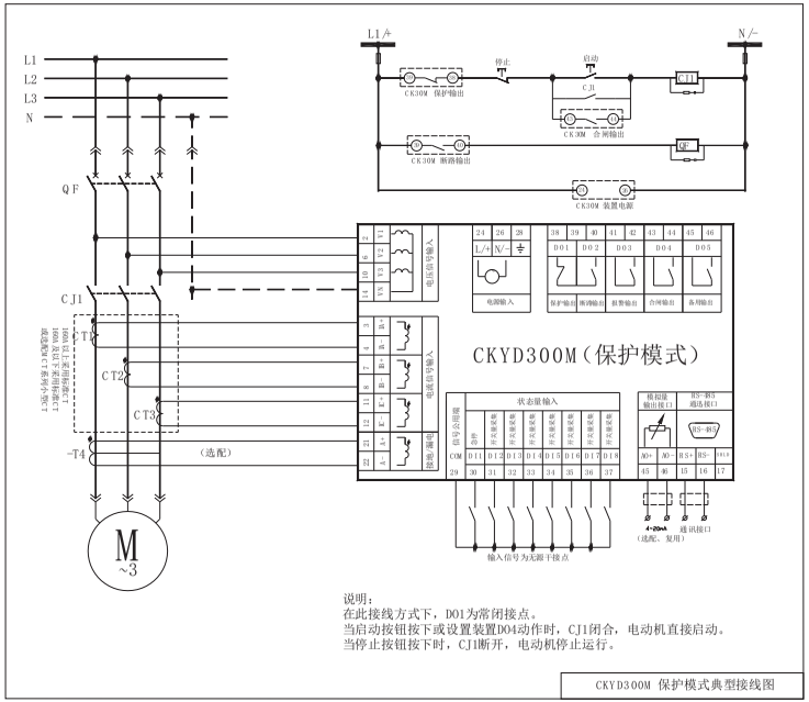 ◆保護模式下,DO1為跳接觸器輸出,為常閉接點。常閉接點指繼電器正常工作時得電吸合,動作時不得電釋放